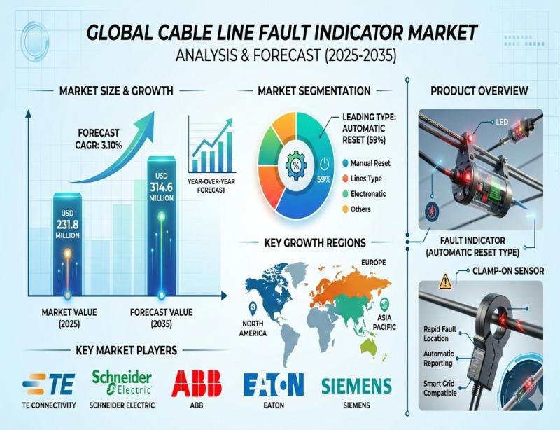 The global power infrastructure ecosystem is undergoing a critical modernization wave as utilities, industries, and governments prioritize grid reliability and real-time monitoring capabilities. The Cable Line Fault Indicator Market, valued at USD 231.8 million in 2025, is projected to reach USD 314.6 million by 2035, expanding at a steady CAGR of 3.1%. According to the latest industry outlook from Future Market Insights (FMI), the increasing complexity of electrical distribution networks and the rising demand for automated fault detection systems are transforming how utilities approach power monitoring and outage management.Fault indicators-deployed across overhead lines and underground cables-are emerging as critical tools for identifying and localizing electrical faults. As global power demand rises and aging grid infrastructure faces growing stress, utilities are turning to advanced monitoring systems that reduce downtime, enhance operational efficiency, and support long-term grid modernization initiatives.