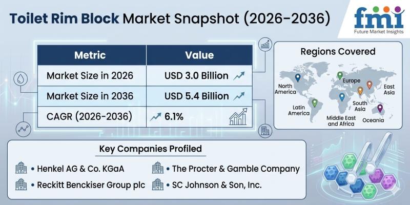 The global toilet rim block market is projected to expand steadily over the next decade, increasing from USD 3.0 billion in 2026 to USD 5.4 billion by 2036, registering a CAGR of 6.1% during the forecast period, according to the latest analysis by Future Market Insights (FMI).