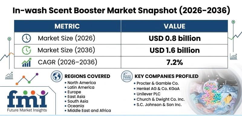 The global in-wash scent booster market is projected to grow steadily over the next decade, expanding from USD 0.8 billion in 2026 to USD 1.6 billion by 2036, registering a CAGR of 7.2%, according to the latest analysis by Future Market Insights (FMI).