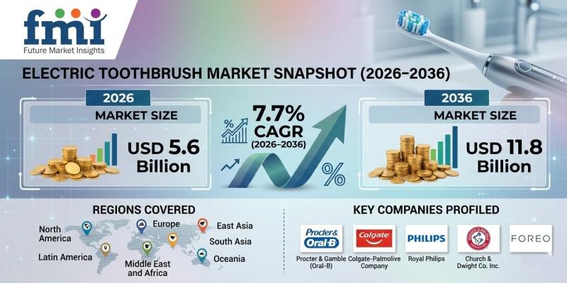 The global electric toothbrush market is poised for strong growth over the next decade, expanding from USD 5.6 billion in 2026 to USD 11.8 billion by 2036, registering a CAGR of 7.7%, according to the latest analysis by Future Market Insights (FMI).