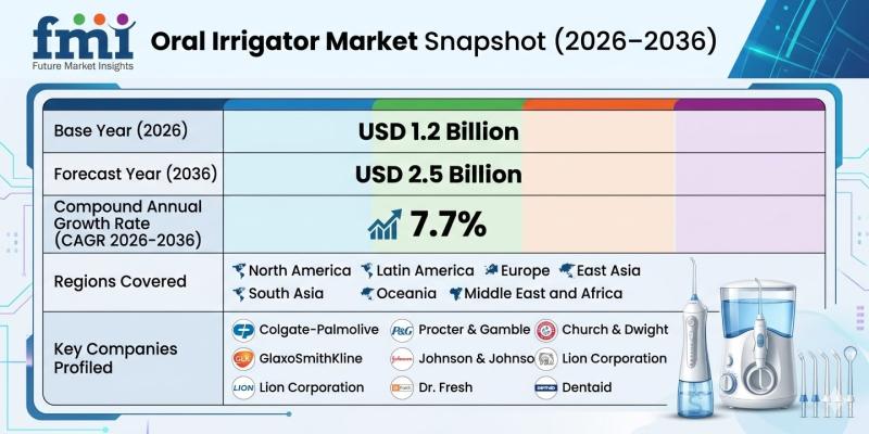 The global oral irrigator market is projected to expand steadily over the next decade, growing from USD 1.2 billion in 2026 to USD 2.5 billion by 2036, registering a CAGR of 7.7% during the forecast period. According to the latest analysis by Future Market Insights (FMI), increasing awareness of preventive oral hygiene and the rising adoption of water-based dental cleaning devices are key factors fueling market expansion.