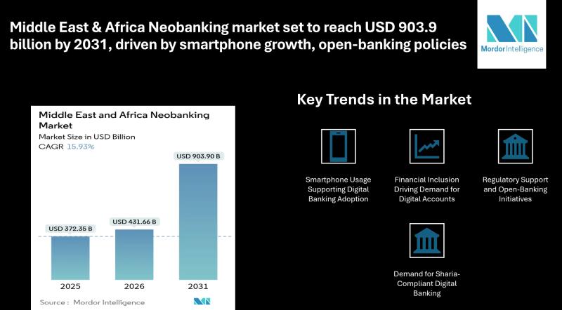 According to Mordor Intelligence, the Middle East & Africa Neo banking market size is estimated at USD 431.66 billion in 2026, rising from USD 372.35 billion in 2025 and projected to reach USD 903.9 billion by…