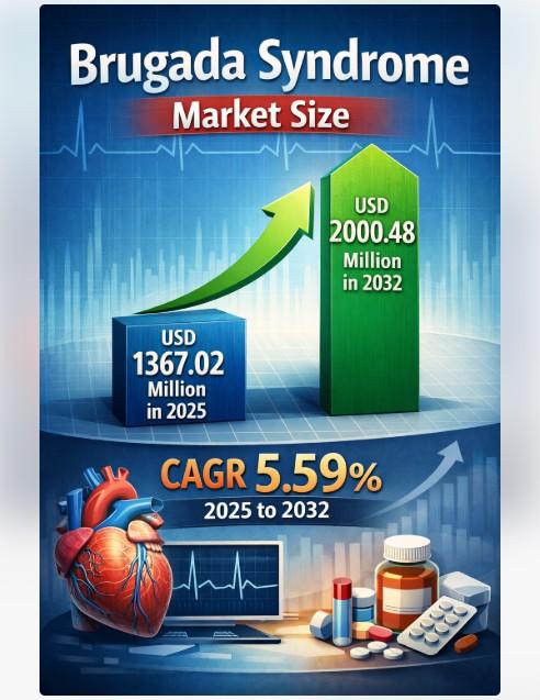 Brugada Syndrome Market Size, Share & Forecast (2025-2032)The global Brugada Syndrome market is experiencing steady growth as healthcare systems increasingly focus on the early identification and prevention of sudden cardiac death associated with inherited cardiac arrhythmia disorders. The market was valued at USD 1,367.02 million in 2025 and is projected to reach USD 2,000.48 million by 2032, expanding at a compound annual growth rate (CAGR) of 5.59% from 2025 to 2032.
