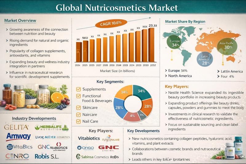 The nutricosmetics market is experiencing steady growth due to increasing consumer demand for beauty products that promote skin, hair, and nail health from within. Nutricosmetics combine nutritional supplements with cosmetic benefits, using ingredients such as vitamins, collagen peptides, antioxidants, and plant extracts…