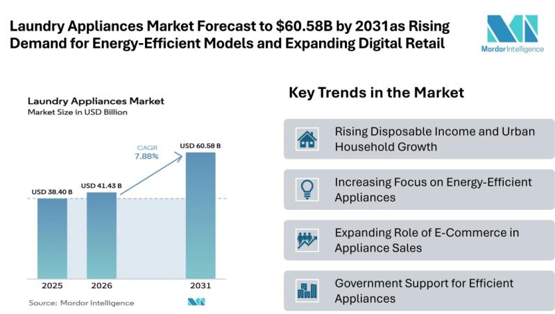 According to Mordor Intelligence, the laundry appliances market size [https://www.mordorintelligence.com/industry-reports/global-laundry-appliances-market-industry?utm_source=abnewswire] is projected to grow from USD 38.40 billion in 2025 to USD 41.43 billion in 2026, and the forecast indicates the sector will reach USD 60.58 billion by 2031, growing at a CAGR of 7.88% between 2026 and 2031. Growth in the laundry appliances industry is supported by rising urbanization, changing lifestyles, and stronger demand for energy-efficient home appliances. As urban populations increase, households increasingly rely on automated washing solutions to manage daily routines. These lifestyle changes contribute to steady laundry appliances market growth, especially in regions experiencing expanding middle-income populations.