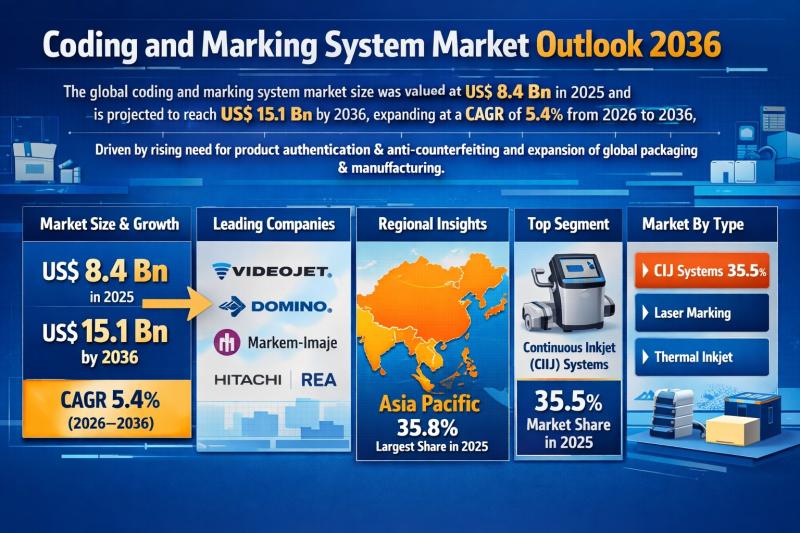 The global coding and marking system market continues to witness steady expansion as industries increasingly require reliable product traceability and identification technologies. The market size was valued at US$ 8.4 Bn in 2025 and is projected to reach US$ 15.1 Bn by 2036, growing at a compound annual growth rate (CAGR) of 5.4% from 2026 to 2036.