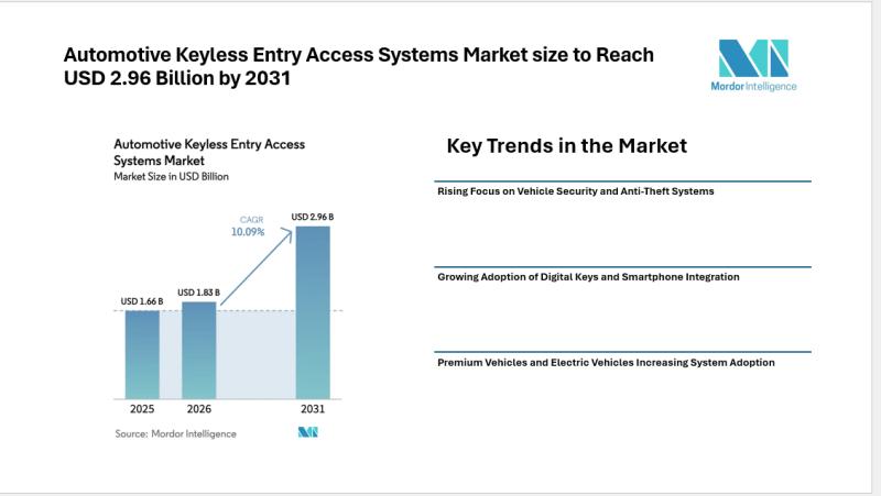 According to Mordor Intelligence, the automotive keyless entry access systems market size is estimated at USD 1.66 billion in 2025, increasing to USD 1.83 billion in 2026, and projected to reach USD 2.96 billion by 2031, supported by a CAGR of 10.09% during the forecast period.