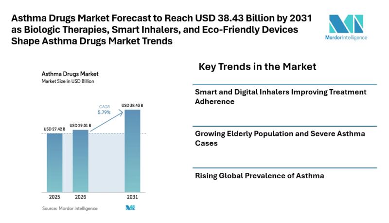 According to Mordor Intelligence, the asthma drugs market size was valued at USD 27.42 billion in 2025 and is estimated to grow from USD 29.01 billion in 2026 to reach USD 38.43 billion by 2031, reflecting steady asthma drugs market growth during the forecast period.…