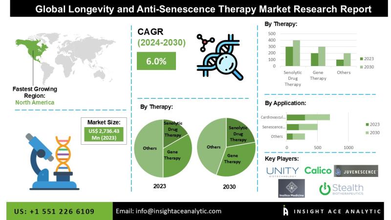 InsightAce Analytic Pvt. Ltd. announces the release of a market assessment report on the "Global Longevity and Anti-Senescence Therapy Market- by Therapy (Senolytic Drug Therapy, Gene Therapy, Cell Therapy, Mitochondrial Therapy, Immunotherapy, and Others), Application (Longevity, Senescence Inhibition, Cardiovascular Diseases, Neural Degenerative Diseases, Ophthalmology Disorders, and Cancer), Trends, Industry Competition Analysis, Revenue and Forecast To 2030."According to the latest research by InsightAce Analytic, the global Longevity and Anti-Senescence Therapy Market Size is valued at USD 2,736.43 million in 2023 and is predicted to reach USD 4,121.54 million by the year 2030 at a 6.8 % CAGR during the forecast period for 2024-2030.