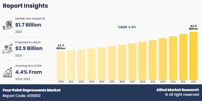 Allied Market Research published a report, titled, "Pour Point Depressants Market by Type (Ethylene Vinyl-acetate (EVA), Styrene Esters, Poly Acrylate, Phthalic Acid Esters, Poly Alpha Olefin, Others), by Method (Surface Adsorption, Co-Crystallization), by End-Use Industry (Industrial, Automotive, Marine, Aviation, Oil and Gas, Others): Global Opportunity Analysis and Industry Forecast, 2024-2033". According to the report, the "pour point depressants market" was valued at $1.7 billion in 2020, and is estimated to