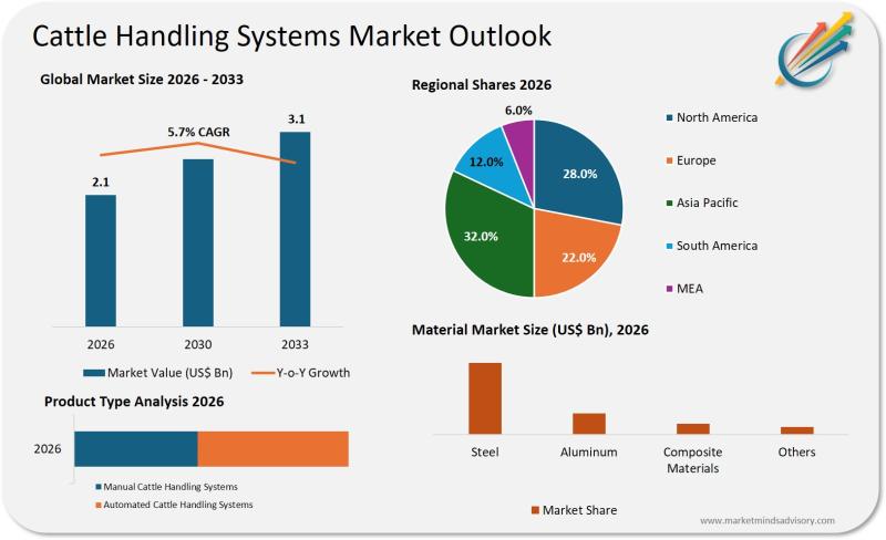 Cattle Handling Systems Market OverviewThe global cattle handling systems market is positioned for steady expansion, with a projected value of USD 3.1 billion by 2033, up from USD 2.1 billion in 2026, according to Market Minds Advisory. This growth trajectory is underpinned by the increasing adoption of automated solutions, heightened focus on animal welfare, and the integration of smart technologies into livestock management. Current market dynamics reflect a shift from traditional manual handling to advanced systems that prioritize operational efficiency, safety, and regulatory compliance.