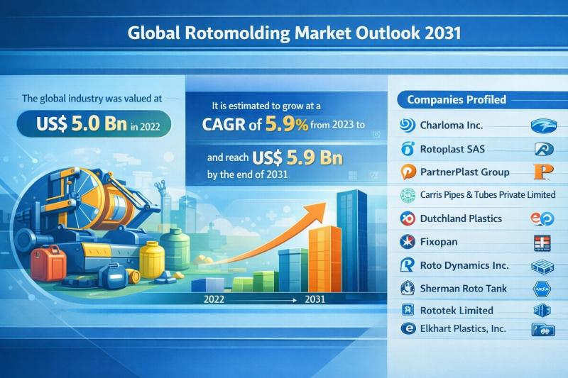 The global rotomolding market was valued at US$ 5.0 Bn in 2022 and is projected to reach US$ 5.9 Bn by the end of 2031, expanding at a compound annual growth rate (CAGR) of 5.9% from 2023 to 2031. This steady growth trajectory reflects increasing adoption of rotational molding technologies across industries such as construction, automotive, packaging, and agriculture.