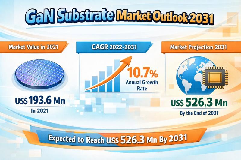 The global Gallium Nitride (GaN) substrate market is witnessing robust growth, fueled by increasing adoption in high-performance electronics, electric vehicles, and energy-efficient lighting. According to recent industry analysis, the market, valued at US$ 193.6 Mn in 2021, is projected to reach US$ 526.3 Mn by 2031, expanding at a CAGR of 10.7% during the forecast period (2022-2031).