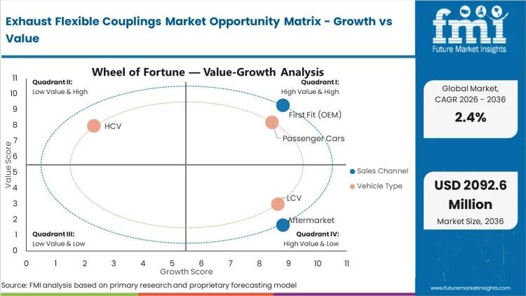 The global Exhaust Flexible Couplings Market is projected to grow from USD 1,650.8 million in 2026 to USD 2,085.6 million by 2036, expanding at a CAGR of 2.4% over the forecast period. Market momentum is supported by sustained passenger and commercial vehicle production, tightening global vehicle emission standards, and increasing integration of vibration-absorbing exhaust components designed to enhance durability while reducing noise, vibration, and harshness (NVH).