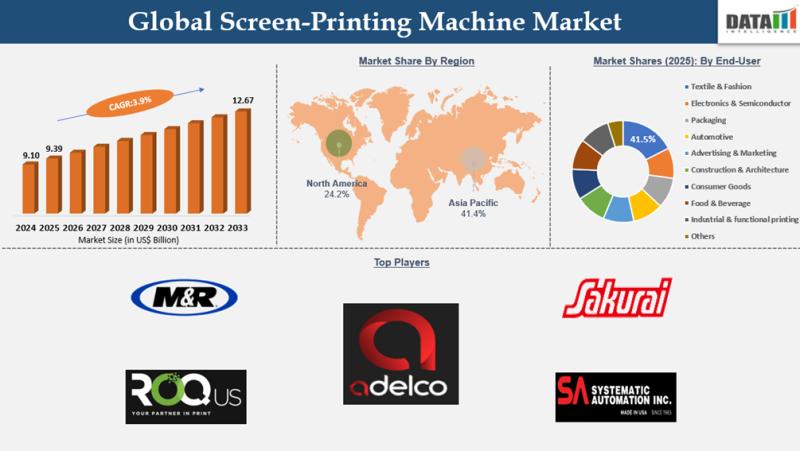 The Global Screen-Printing Machine Market size reached US$ 9.39 billion in 2025 and is expected to reach US$ 12.67 billion by 2033, growing with a CAGR of 3.9% during the forecast period 2026-2033.