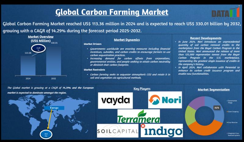 The Global Carbon Farming Market size reached US$ 113.36 million in 2024 and is expected to reach US$ 330.01 billion by 2032, growing with a CAGR of 14.29% during the forecast period 2025-2032.