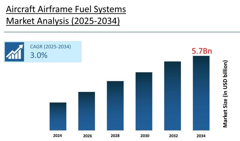 The Aircraft Airframe Fuel Systems Market is projected to reach USD 5.7 billion by 2034, expanding at a CAGR of 3.0% during 2025-2034. The market size stood at USD 4.1 billion in 2024, reflecting steady demand across commercial and military aviation. Aircraft airframe fuel systems include integrated components that store, manage, and deliver fuel from tanks to engines during all flight phases. These systems ensure safe, continuous fuel flow and enable functions such as fuel transfer, measurement, and system monitoring. A key structural growth driver is the expansion of global aircraft fleets and order backlogs, which increases the need for advanced and reliable fuel systems integrated into new aircraft platforms. Increasing aircraft production and fleet modernization are structurally expanding demand for airframe fuel systems across OEM supply chains.Stratview Research, a global market research firm, has launched a report on the global market, which provides a comprehensive outlook of the global and regional industry forecast, current & emerging market trends, segment analysis, competitive landscape, & more. The report analyzes the aircraft airframe fuel systems market across multiple dimensions including aircraft type, component type, technology type, end-user type, and region. It evaluates long-term industry trends, growth opportunities, and competitive dynamics relevant to manufacturers, suppliers, OEMs, and aerospace investors.