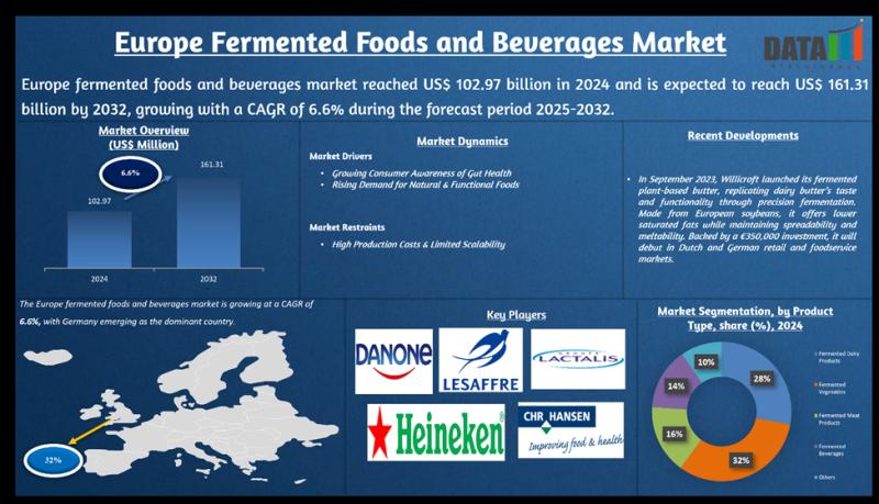 Europe fermented food and beverages market reached US$102.97 billion in 2024 and is expected to reach US$161.31 billion by 2032, growing at a CAGR of 6.6% during the forecast period 2025-2032.