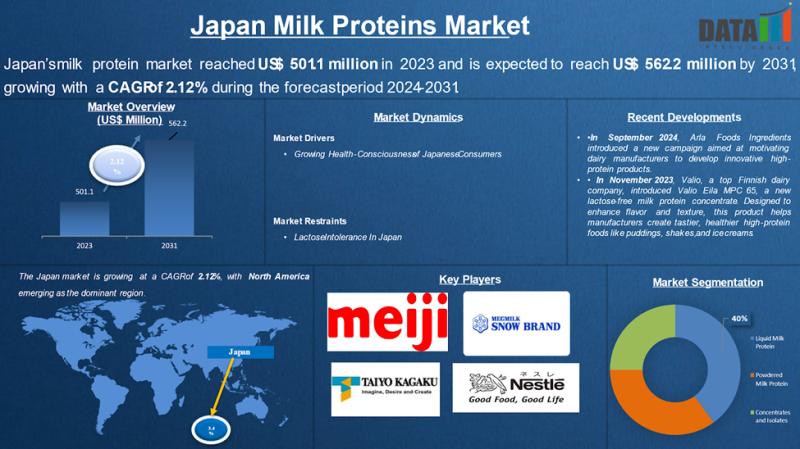 Japan's Milk Proteins Market reached US$ 501.1 million in 2023 and is expected to reach US$ 562.2 million by 2031, growing with a CAGR of 2.12 % during the forecast period 2024-2031.