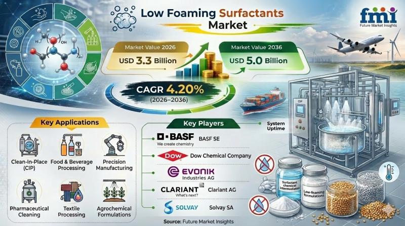 The global low foaming surfactants market is projected to grow from USD 3.3 billion in 2026 to USD 5.0 billion by 2036, expanding at a CAGR of 4.20%. Unlike volume-driven chemical markets, growth in this segment is tightly linked to process reliability and operational efficiency, particularly in automated and closed-loop cleaning systems where foam control directly impacts productivity and cost.