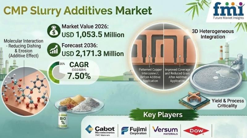 The global CMP slurry additives market is entering a high-value growth phase, projected to expand from USD 1,053.5 million in 2026 to USD 2,171.3 million by 2036, registering a CAGR of 7.5%.