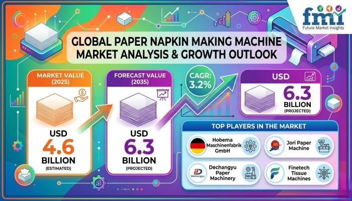 The global paper napkin making machine market is entering a phase of steady industrial modernization as manufacturers invest in automation, sustainable materials, and high-efficiency production lines. According to the latest industry analysis, the market is expected to reach USD 4.6 billion in 2025 and expand to USD 6.3 billion by 2035, registering a compound annual growth rate (CAGR) of 3.2% during the forecast period.