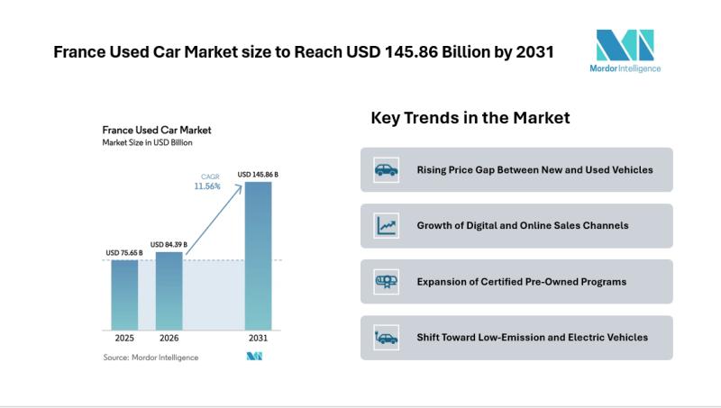 According to Mordor Intelligence, the France used car market size is estimated at USD 84.39 billion in 2026, rising from USD 75.65 billion in 2025, and is projected to reach USD 145.86 billion by 2031, growing at a CAGR of 11.56% during the forecast period.