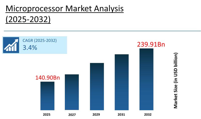 The microprocessor market encompasses the design, manufacture, and sale of integrated circuits that serve as the central processing units of electronic devices, spanning consumer electronics, automotive systems, industrial automation, telecommunications, healthcare, and IoT. The market was valued at USD 130.1 billion in 2024 and is projected to reach USD 239.91 billion by 2032, growing at a CAGR of 7.9% over the 2025-2032 forecast period.