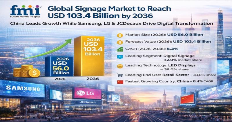 The global signage market is entering a transformative growth phase as businesses increasingly shift toward digital, data-driven visual communication systems. According to industry analysis by Future Market Insights (FMI), the market is projected to grow from USD 56.0 billion in 2026 to approximately USD 103.4 billion by 2036, expanding at a compound annual growth rate (CAGR) of 6.3% during the forecast period.
