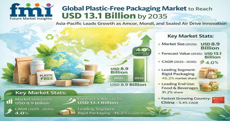 The global plastic-free packaging market is entering a phase of steady and structural expansion as industries accelerate the shift toward sustainable alternatives to conventional plastic packaging. Driven by regulatory mandates, corporate sustainability commitments, and evolving consumer preferences, the market is projected to grow from USD 8.9 billion in 2025 to approximately USD 13.1 billion by 2035, expanding at a compound annual growth rate (CAGR) of 4.0% during the forecast period.
