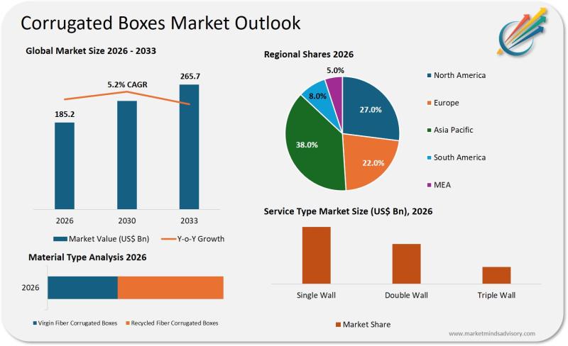 The corrugated boxes market is currently positioned as a foundational segment within the global packaging industry, serving a diverse range of sectors including e-commerce, food and beverage, pharmaceuticals, and consumer goods. In 2026, the market is projected to reach USD 185.2 billion, reflecting robust baseline demand for cost-effective, recyclable, and protective packaging solutions. The sector is witnessing accelerated adoption of advanced manufacturing processes such as digital printing…