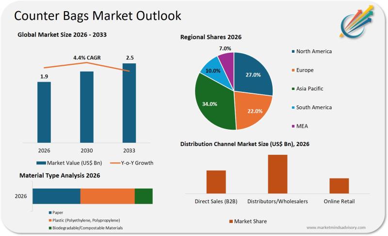 The global counter bags market is positioned for steady expansion, with Market Minds Advisory projecting growth from USD 1.90 billion in 2026 to USD 2.48 billion by 2033, reflecting a compound annual growth rate (CAGR) of 4.4%. This market serves a critical role in retail, food service, and specialty sectors, where counter bags are integral to product protection, branding, and customer convenience. Demand is underpinned by the…
