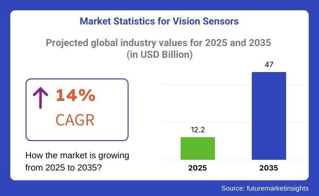 The global Vision Sensor Market is witnessing strong momentum as industries accelerate automation and digital transformation initiatives. The market is projected to reach USD 12.2 billion by 2025 and expand at a 14.0% CAGR, ultimately reaching USD 47 billion by 2035.