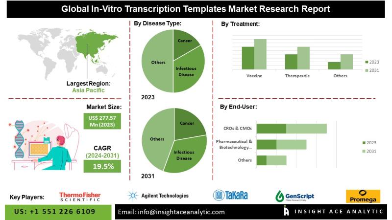 InsightAce Analytic Pvt. Ltd. announces the release of a market assessment report on the "Global In-vitro Transcription Templates Market - (By Disease Type (Cancer (Solid Tumors, Colorectal Cancer, NSCLC, Melanoma, Leukemia, Prostate Cancer, Others), Infectious Disease (Influenza, COVID-19, AIDS, Others), Lifestyle Disease, Genetic Disease, Others), By Treatment (Vaccine, Therapeutic), By Research Stage (Exploratory, Clinical), By End-User (Pharmaceutical & Biotechnology Companies, CROs & CMOs, Academics & Research, Others)), Trends, Industry Competition…