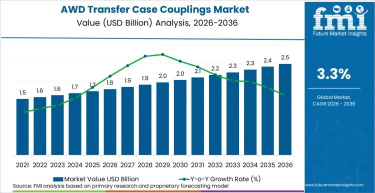 The global AWD transfer case couplings market is undergoing a structural transformation as automotive manufacturers pivot toward advanced drivetrain technologies. Valued at USD 1.8 billion in 2026, the market is projected to reach USD 2.5 billion by 2036, expanding at a steady CAGR of 3.3%.