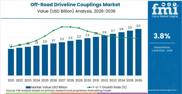 The global Off-Road Driveline Couplings Market is poised for steady expansion, with market value projected to grow from USD 2.1 billion in 2026 to USD 3.1 billion by 2036, registering a compound annual growth rate (CAGR) of 3.8%. The market's growth trajectory reflects increasing reliance on high-efficiency power transmission systems across construction, agriculture, and mining equipment operating in demanding environments.