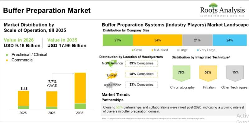 According to our latest market report "Buffer Preparation Market, till 2035, by Scale of Operation, Type of System Component, Type of Buffer Formulation, Type of Molecule, Type of Compatible Biologic, Type of Buffer Packaging and Geographical Regions: Industry Trends and Global Forecasts, till 2035", the global buffer preparation market size is projected to reach USD 17.96 billion by 2035 from USD 8.48 billion in 2025, growing at a CAGR of…
