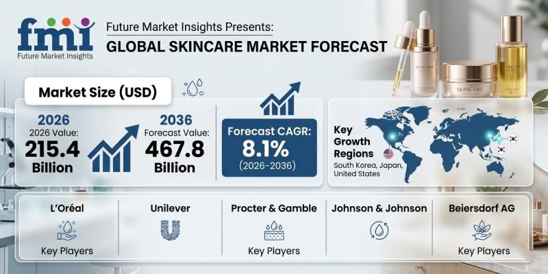 The global Skincare Market is entering a transformative decade, with valuation projected to reach USD 215.4 billion in 2026 and expand at a robust 8.1% CAGR through 2036, ultimately surpassing USD 467.8 billion. This sustained growth trajectory reflects a convergence of clinical dermatology, preventive wellness, and consumer demand for targeted, high-performance skincare solutions.