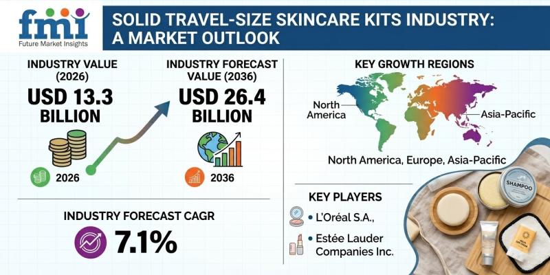 The global Solid Travel-Size Skincare Kits Market is entering a high-growth phase, projected to expand from USD 13.3 billion in 2026 to USD 26.4 billion by 2036, registering a steady CAGR of 7.1%. As travel rebounds worldwide and consumer expectations shift toward convenience-driven premium beauty, solid skincare formats are rapidly emerging as a preferred choice among frequent flyers and modern consumers.