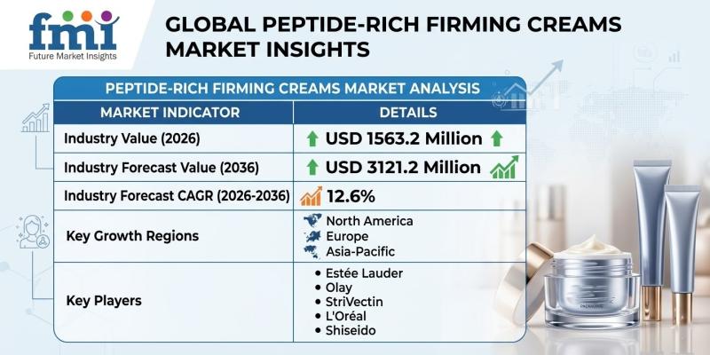The global Peptide-Rich Firming Creams Market is entering a high-growth phase, projected to expand from USD 1,563.2 million in 2026 to USD 3,121.2 million by 2036, registering a robust CAGR of 12.6%. The surge is being driven by a structural shift in consumer expectations-from generic anti-aging claims to scientifically validated, mechanism-led skincare solutions that deliver visible firming and lifting results.