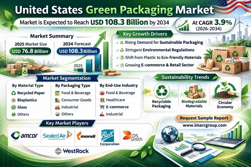 The United States Green Packaging Market is entering a pivotal phase of sustained growth, supported by shifting consumer preferences toward eco-friendly materials, tightening environmental regulations, and rapid innovation in biodegradable and recyclable packaging technologies. The market reached USD 76.8 Billion in 2025 and is projected to surpass USD 108.3 Billion by 2034, exhibiting a CAGR of 3.9% during 2026-2034.