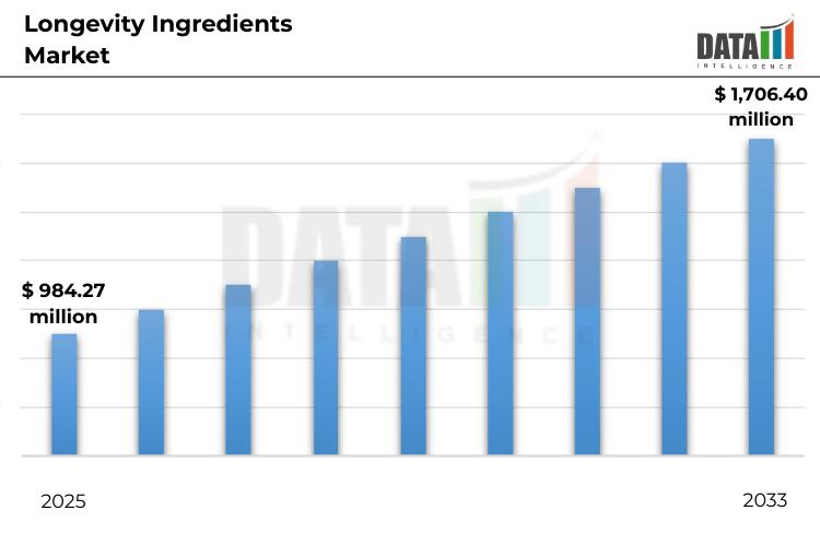 "Global Longevity Ingredients Market reached US$ 984.27 million in 2025 and is expected to reach US$ 1,706.40 million by 2033, growing with a CAGR of 7.12% during the forecast period 2026-2033."