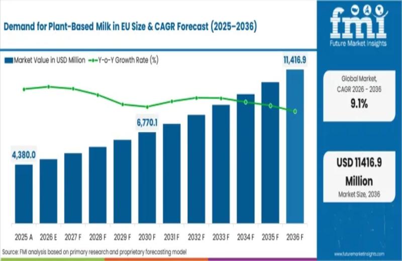 NEWARK, DE, United States - March 18, 2026 - The Demand for Plant-Based Milk in the EU Market is experiencing strong expansion as consumers increasingly shift toward sustainable, dairy-free alternatives. Industry analysis indicates the market will grow from USD 4,778.6 million in 2026 to USD 11,416.9 million by 2036, reflecting a robust CAGR of 9.1% over the forecast period.
