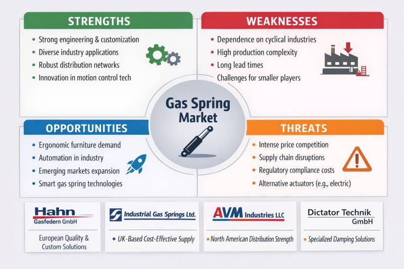 The gas spring market has become an essential component across industries such as automotive, aerospace, healthcare, furniture, and industrial manufacturing. Gas springs, known for their ability to provide controlled motion and force, are increasingly being adopted in ergonomic designs, automation systems, and safety-critical applications. As demand diversifies, the competitive landscape is shaped by innovation, customization capabilities, and global supply chain strength.
