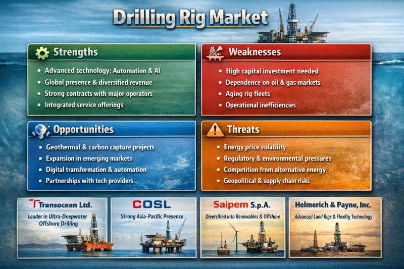 The drilling rig market plays a central role in global energy, mining, and infrastructure development. As demand for oil, gas, geothermal energy, and mineral resources evolves, companies operating in this space are adapting through innovation, operational efficiency, and strategic expansion. This article provides a deep dive into the competitive positioning of leading players, a comprehensive SWOT analysis, and the most relevant investment themes shaping the drilling rig market today.