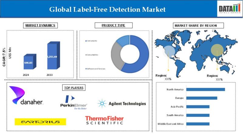The global Label-Free Detection Market reached US$644.83 million in 2024 and is expected to reach US$1,251.49 million by 2033, growing at a CAGR of 7.5% during the forecast period 2025 to 2033. The market is expanding steadily due to growing demand for real-time, high-throughput biomolecular analysis without labeling. Label-free detection technologies enable direct monitoring of molecular interactions, making them highly valuable in drug discovery, proteomics, and clinical diagnostics.