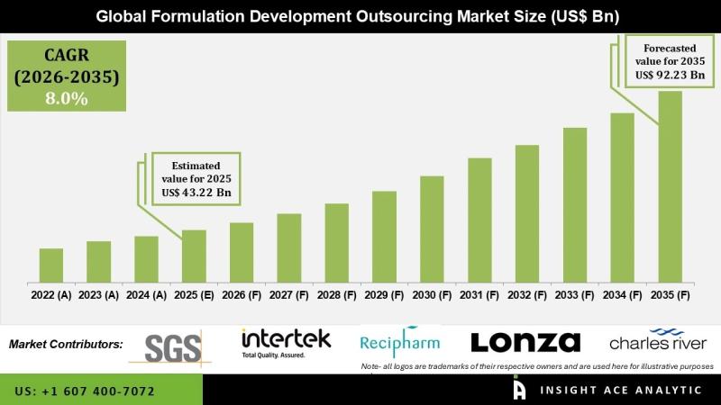 InsightAce Analytic Pvt. Ltd. announces the release of a market assessment report on the "Global Formulation Development Outsourcing Market Size, Share & Trends Analysis Report By Service (Preformulation, Formulation Development), Application (Oncology, Neurology, Infectious Disease, Respiratory, Dermatology) And Formulation (Injectable, Topical, Inhaled, Oral) Market Outlook And Industry Analysis 2035"The Formulation Development Outsourcing Market Size is valued at USD 43.22 billion in 2025 and is predicted to reach USD 92.23 billion by the year 2035 at a 8.0% CAGR during the forecast period for 2026 to 2035.