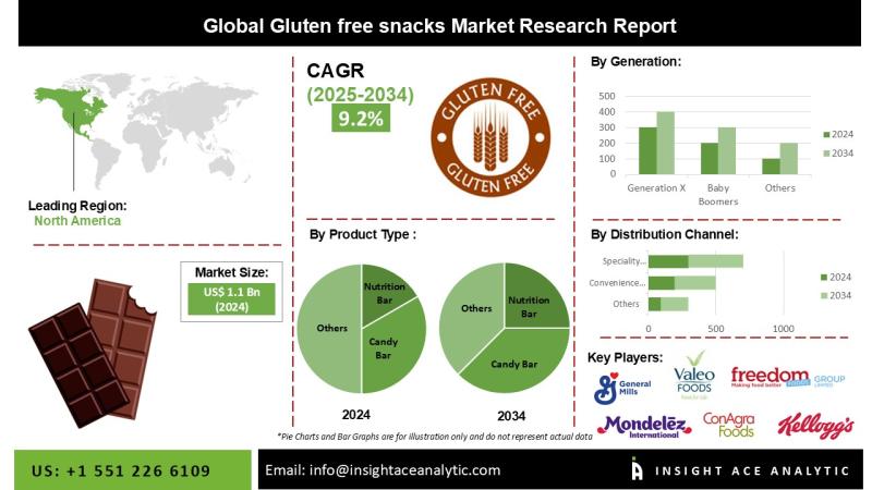 According to a new report by InsightAce Analytic, the " Gluten-free Snacks Market" in terms of revenue was estimated to be worth $ 1.1 Bn in 2024 and is poised to reach $ 2.6 Bn by 2034, growing at a CAGR of 9.2% from 2025 to 2034.