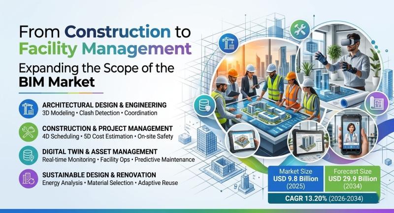 According to a research report by IMARC Group, the global Building Information Modeling (BIM) market was valued at USD 9.8 Billion in 2025. The market is projected to reach USD 29.9 Billion by 2034, exhibiting a robust growth rate (CAGR) of 13.20% during 2026-2034. The market is primarily driven by government mandates for digital project delivery, rapid adoption of cloud-based and AI-integrated platforms, and growing emphasis on lifecycle cost efficiency…