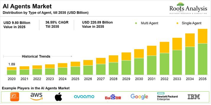 The global AI agents market, valued at USD 15 billion in 2026, will reach USD 221 billion by 2035, advancing at a CAGR of 34.64% over the forecast period, according to a new report by Roots Analysis. This 14-fold expansion reflects surging enterprise demand for automation, the rapid maturation of natural language processing technologies, and the accelerating push by organizations of all sizes to integrate autonomous software agents into core…